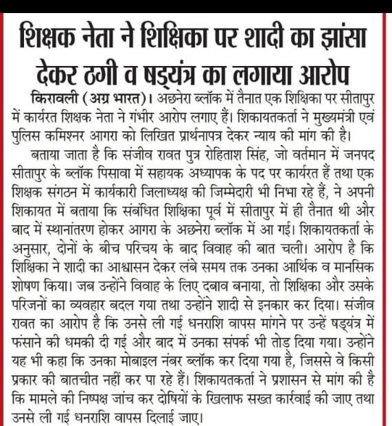 किरावली (अग्र भारत)। अछनेरा ब्लॉक में तैनात एक शिक्षिका पर सीतापुर में कार्यरत शिक्षक नेता ने गंभीर आरोप लगाए ...