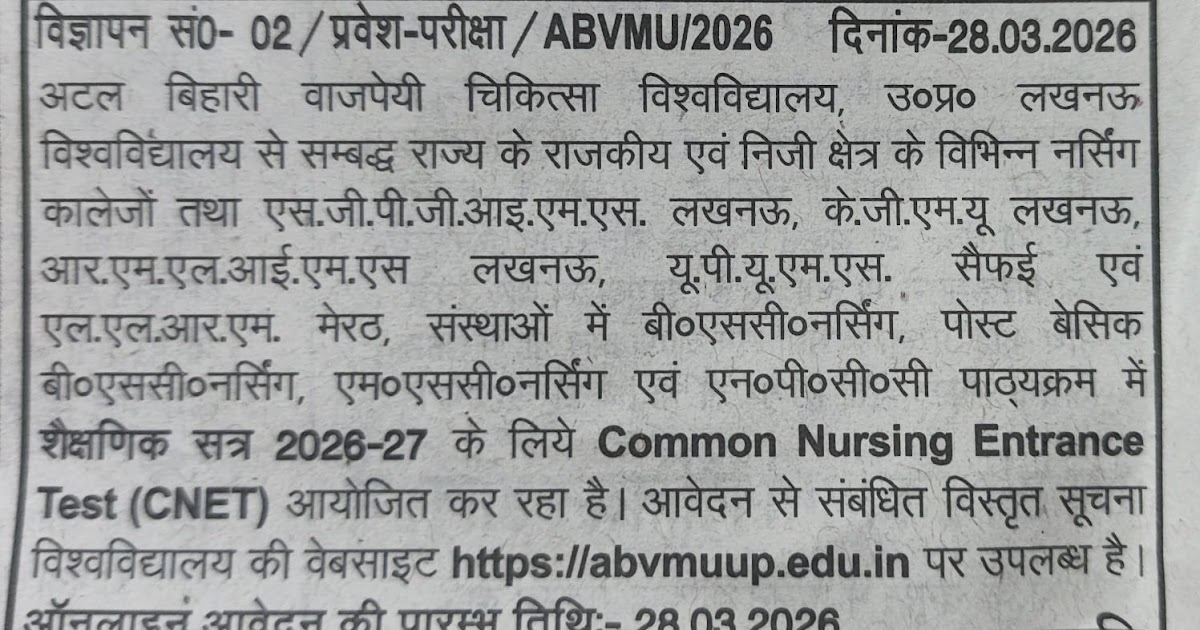 📢 ABVMU CNET 2026-27: बीएससी, पोस्ट बेसिक व एमएससी नर्सिंग प्रवेश हेतु ऑनलाइन आवेदन शुरू – UpdateMarts| PRIMARY KA MASTER | SHIKSHAMITRA | Basic Shiksha News