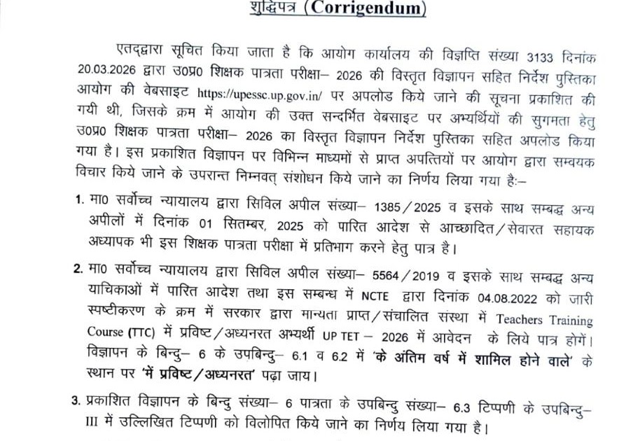 , प्रयागराज : उत्तर प्रदेश शिक्षक पात्रता परीक्षा (यूपीटीईटी)-2026 के विज्ञापन में उत्तर प्रदेश शिक्षा सेवा चयन आयोग ने महत्त्वपूर्ण ...