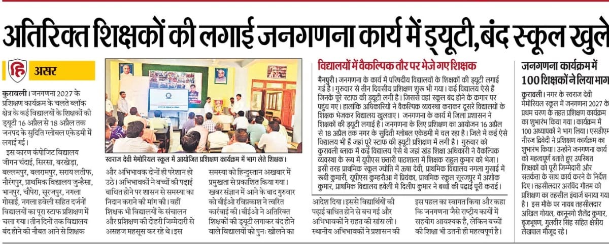 मैनपुरी। आगामी जनगणना के प्रथम चरण को सफल बनाने के लिए सुदिति ग्लोबल एकेडमी में प्रगणकों और सुपरवाइजरों के लिए ...