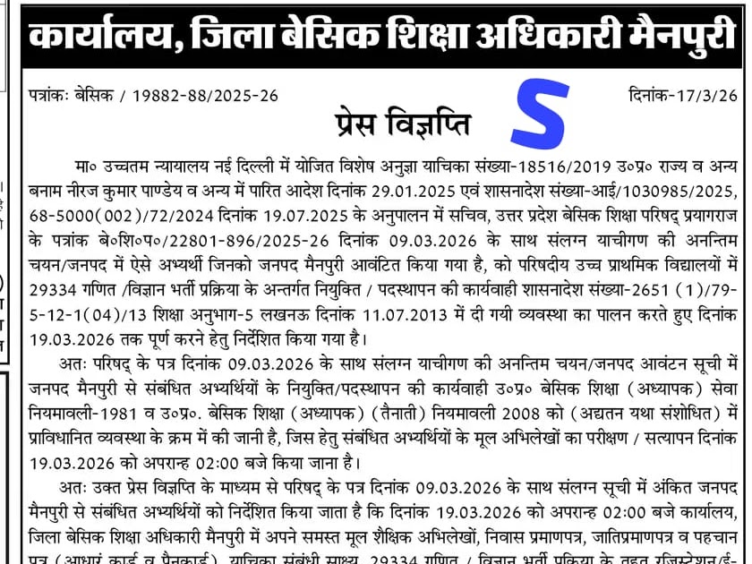29334 गणित विज्ञान भर्ती की जनपद मैनपुरी की काउन्सलिंग विज्ञप्ति – UpdateMarts| PRIMARY KA MASTER | SHIKSHAMITRA | Basic Shiksha News