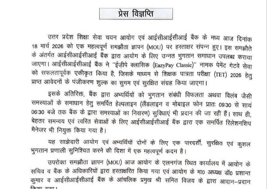 UPTET 2026 के Notification पर कार्य चालू  *UP TET 2026 महत्वपूर्ण सूचना✍️ आयोग ने ICICI Bank के साथ MOU साइन ...