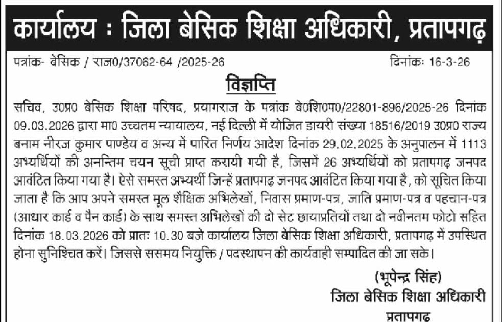 *29334 गणित-विज्ञान शिक्षक भर्ती , आज 18 मार्च को काउंसिलिंग के संबंध में प्रतापगढ़ जनपद की विज्ञप्ति जारी*✅ Basic Shiksha ...