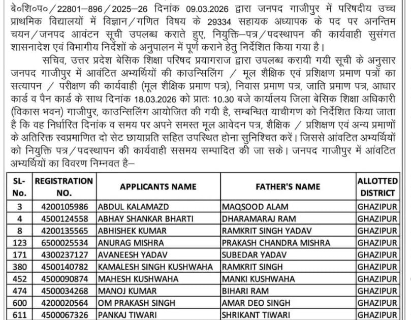 *29334 गणित-विज्ञान शिक्षक भर्ती , 18 मार्च को काउंसिलिंग के संबंध में गाजीपुर जनपद की विज्ञप्ति जारी*✅ Basic Shiksha ...