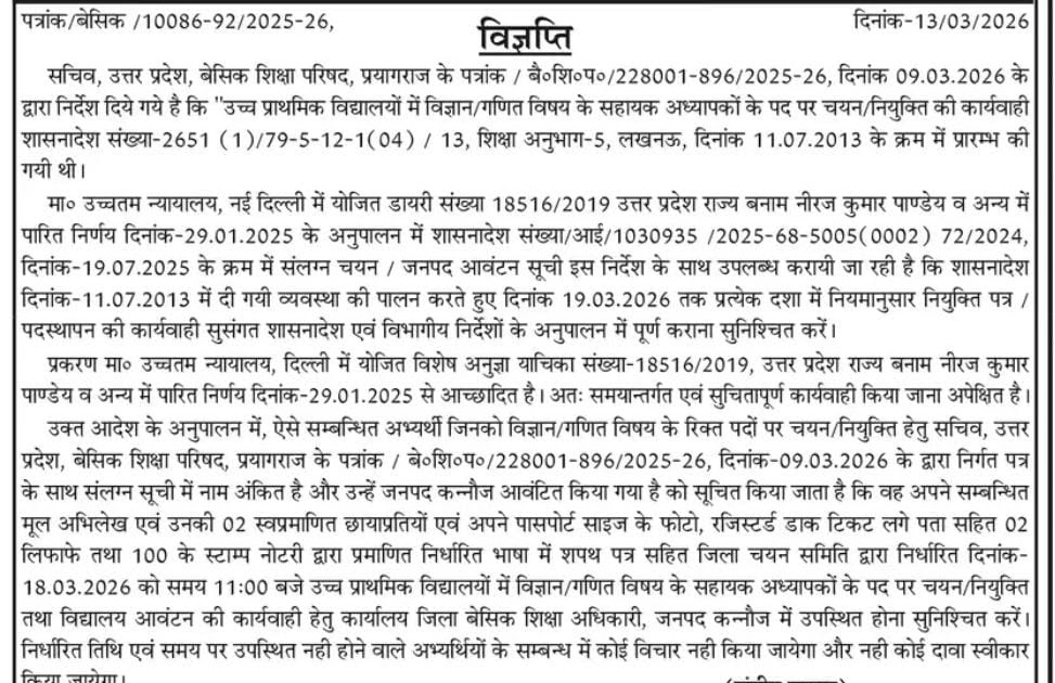 *29334 गणित-विज्ञान शिक्षक भर्ती , 18 मार्च को काउंसिलिंग और 19 को नियुक्त पत्र देने के संबंध में कन्नौज ...