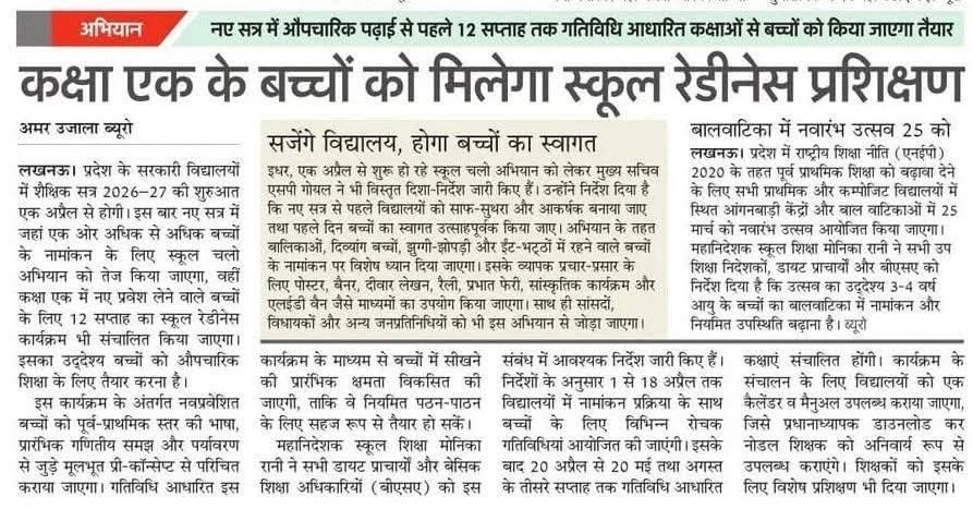 लखनऊ। प्रदेश के परिषदीय विद्यालयों में नया सत्र 2026-27 एक अप्रैल से शुरू हो रहा है। इससे पहले विद्यालयों ...