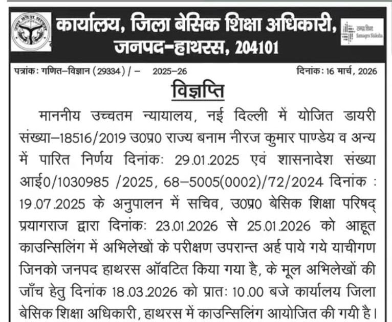 *29334 गणित-विज्ञान शिक्षक भर्ती , 18 मार्च को काउंसिलिंग के संबंध में हाथरस जनपद की विज्ञप्ति जारी*✅ Basic Shiksha Khabar ...