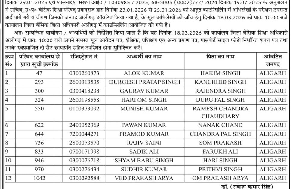 *29334 गणित-विज्ञान शिक्षक भर्ती , 18 मार्च को काउंसिलिंग के संबंध में अलीगढ़ जनपद की विज्ञप्ति जारी*✅ Basic Shiksha Khabar ...