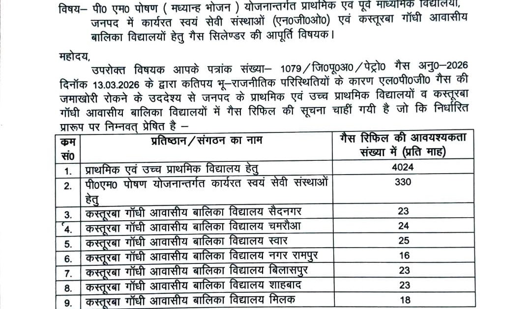 पी० एम० पोषण (मध्यान्ह भोजन योजनान्तर्गत प्राथमिक एवं पूर्व माध्यमिक विद्यालयों, जनपद में कार्यरत स्वयं सेवी संस्थाओं (एन०जी०ओ०) एवं कस्तूरबा गाँधी आवासीय बालिका विद्यालयों हेतु गैस सिलेण्डर की आपूर्ति विषयक । – UpdateMarts| PRIMARY KA MASTER | SHIKSHAMITRA | Basic Shiksha News