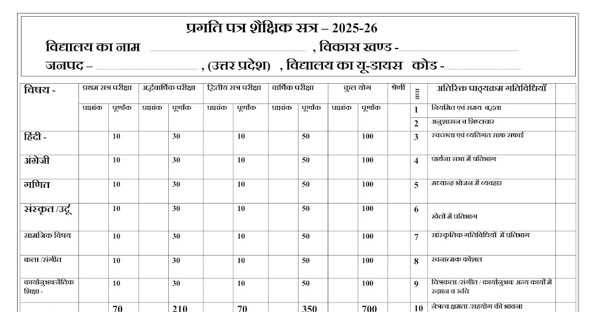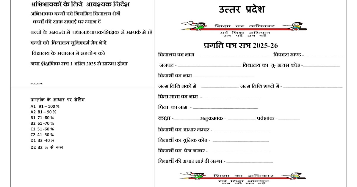अंक पत्र (रिपोर्ट कार्ड) : प्रगति पत्र शैक्षिक सत्र – 2025-26 कक्षा 1-5 – UpdateMarts| PRIMARY KA MASTER | SHIKSHAMITRA | Basic Shiksha News