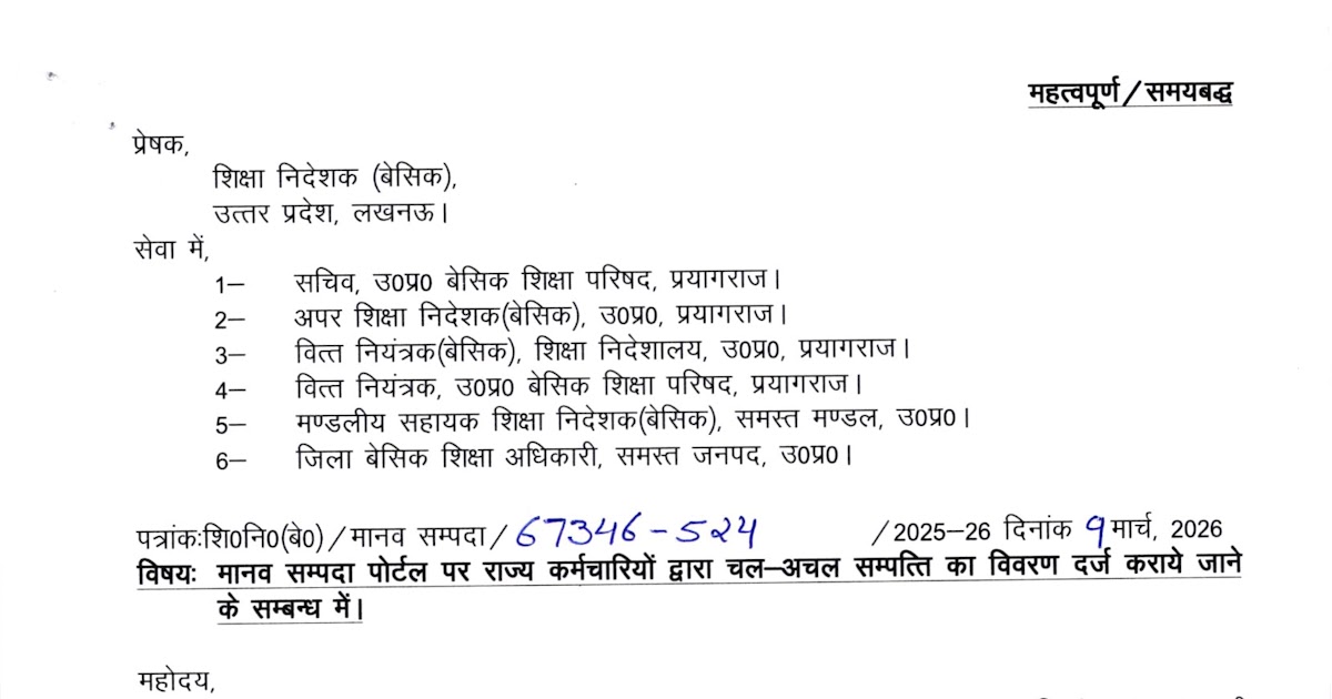 मानव सम्पदा पोर्टल पर राज्य कर्मचारियों द्वारा चल-अचल सम्पत्ति का विवरण दर्ज कराये जाने के सम्बन्ध में। Basic Shiksha ...