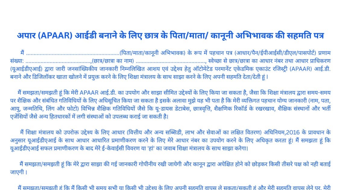 📚 APAAR ID बनाने के लिए अभिभावक की सहमति आवश्यक छात्रों की APAAR ID बनाने के लिए अभिभावकों/कानूनी अभिभावक से ...