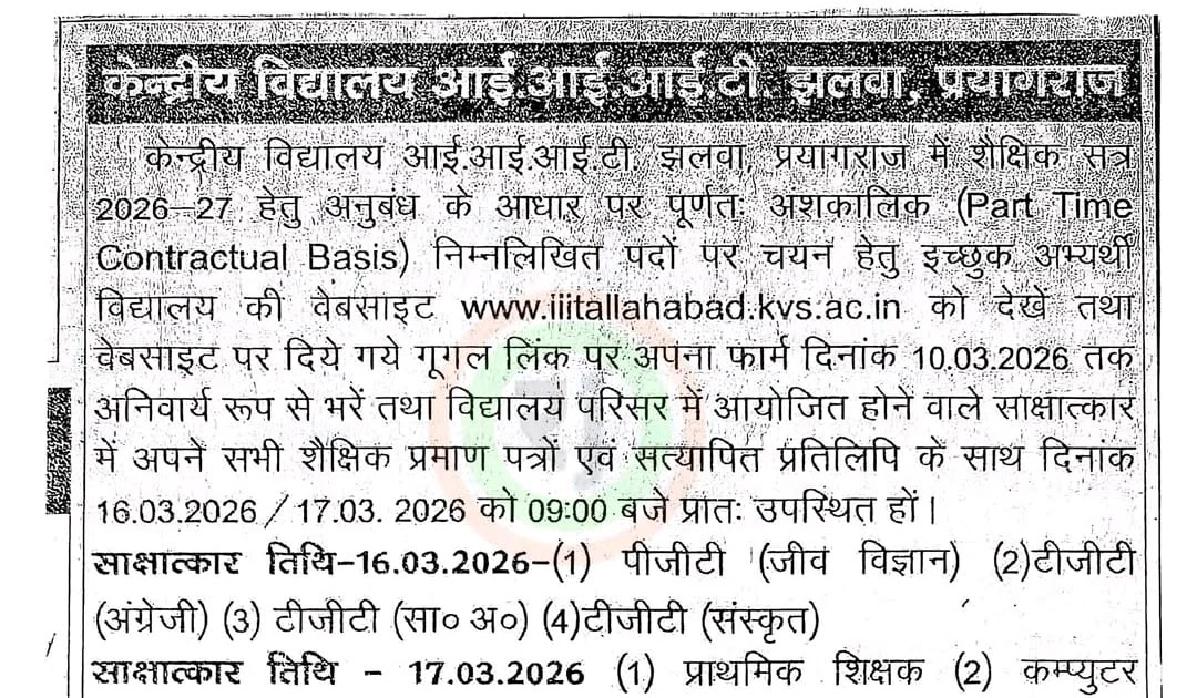 संविदा शिक्षक भर्ती का विज्ञापन जारी, 16–17 मार्च को साक्षात्कार केन्द्रीय विद्यालय IIT झलवा, प्रयागराज में संविदा शिक्षक भर्ती ...