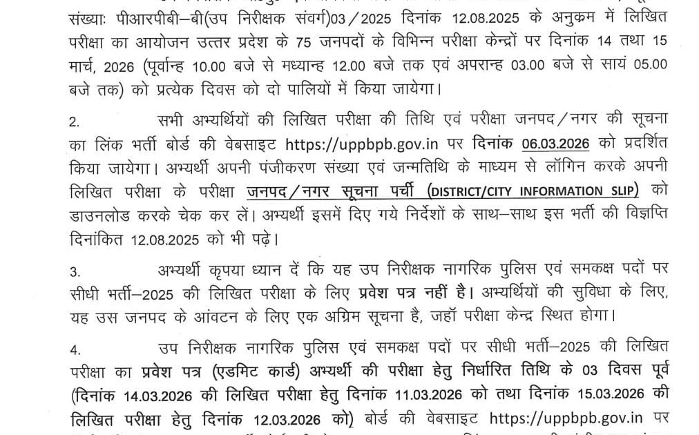 UP Police SI भर्ती परीक्षा 2025, लिखित परीक्षा 14 और 15 मार्च 2026 को होगी , देखें आदेश – UpdateMarts| PRIMARY KA MASTER | SHIKSHAMITRA | Basic Shiksha News