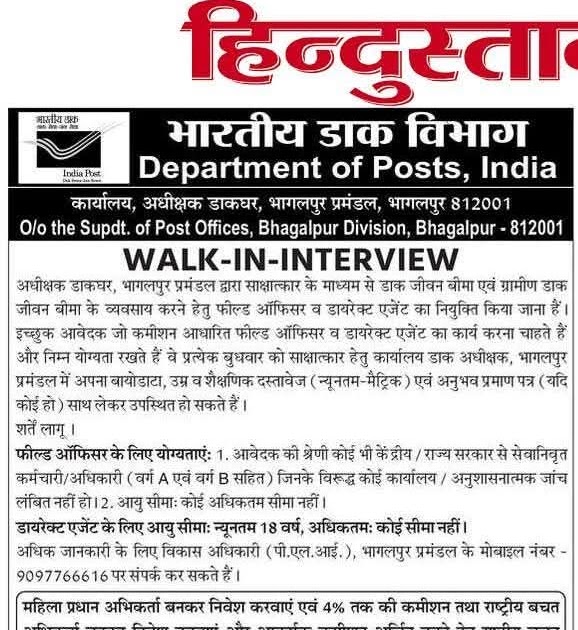भारतीय डाक विभाग के द्वारा भागलपुर प्रमंडल के लिए साक्षात्कार के माध्यम से नियुक्तियां की जानी है|इच्छुक का अभ्यर्थी आवेदन जरूर करें| – UpdateMarts| PRIMARY KA MASTER | SHIKSHAMITRA | Basic Shiksha News