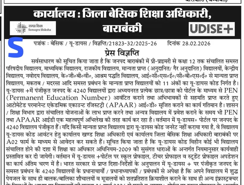 बाराबंकी: सभी मान्यता प्राप्त विद्यालयों के लिए UDISE+ कोड व APAAR अपडेट अनिवार्य, 6 मार्च तक प्रोफाइल पूर्ण करने ...