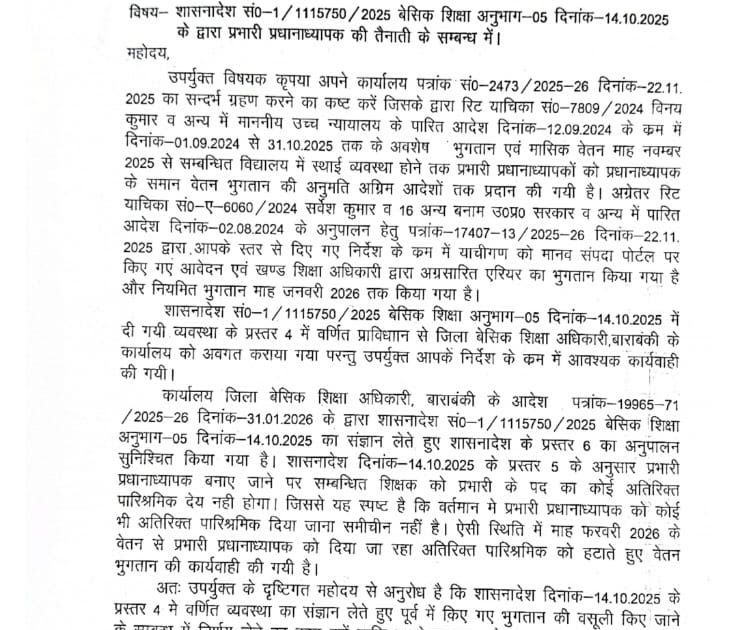 बाराबंकी में प्रभारी प्रधानाध्यापकों को अतिरिक्त पारिश्रमिक भुगतान पर रोक, शासनादेश के अनुपालन के निर्देश जारी – UpdateMarts| PRIMARY KA MASTER | SHIKSHAMITRA | Basic Shiksha News
