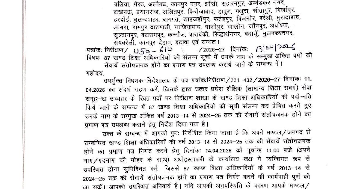 87 खण्ड शिक्षा अधिकारियों की संलग्न सूची में उनके नाम के सम्मुख अंकित वर्षों की सेवायें संतोषजनक होने का प्रमाण पत्र उपलब्ध कराये जाने के सम्बन्ध में – UpdateMarts| PRIMARY KA MASTER | SHIKSHAMITRA | Basic Shiksha News