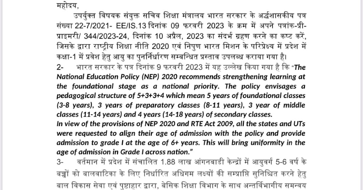 राष्ट्रीय शिक्षा नीति 2020 के परिप्रेक्ष्य में कक्षा-1 में प्रवेश की आयु के पुनर्निर्धारण के सम्बन्ध में। – UpdateMarts| PRIMARY KA MASTER | SHIKSHAMITRA | Basic Shiksha News