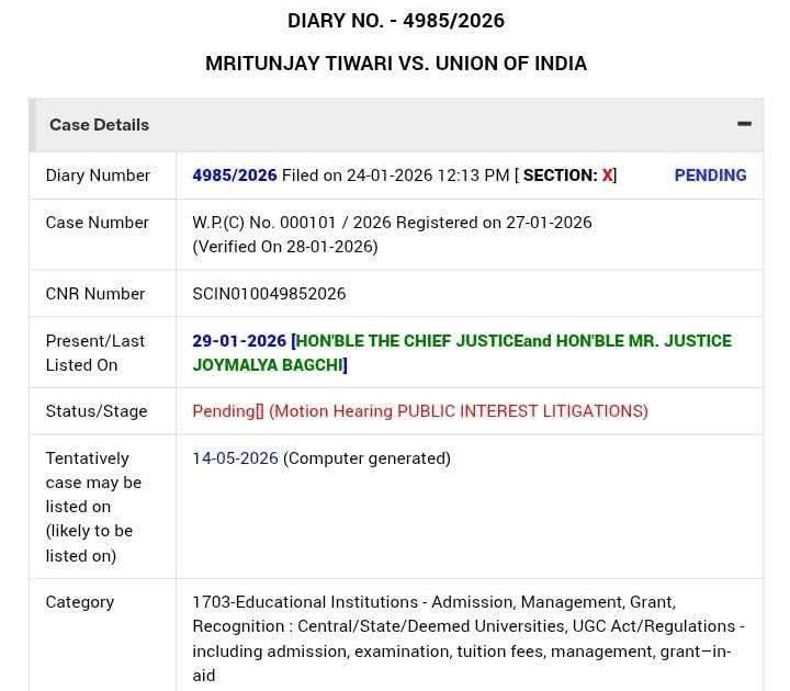 MRITUNJAY TIWARI VS UNION OF INDIA UGC रेगुलेशन 2026 पर सुनवाई टली अब अगली संभावित तिथि 14/05/2026 को है। ...