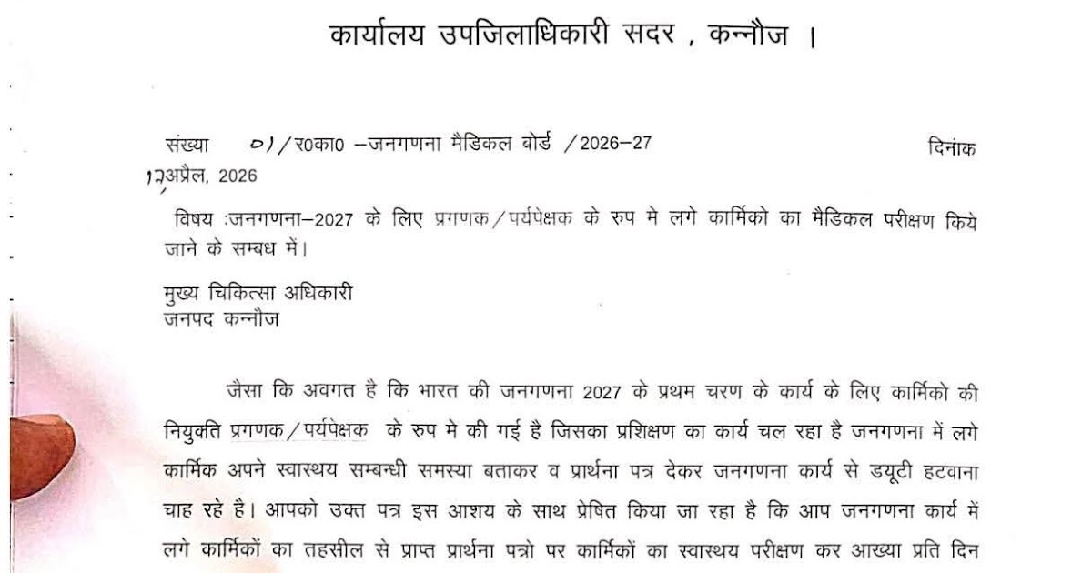 📰 जनगणना 2027 ड्यूटी से बचने के लिए अब होगा मेडिकल परीक्षण अनिवार्य! कन्नौज। जनगणना 2027 को लेकर प्रशासन ने ...