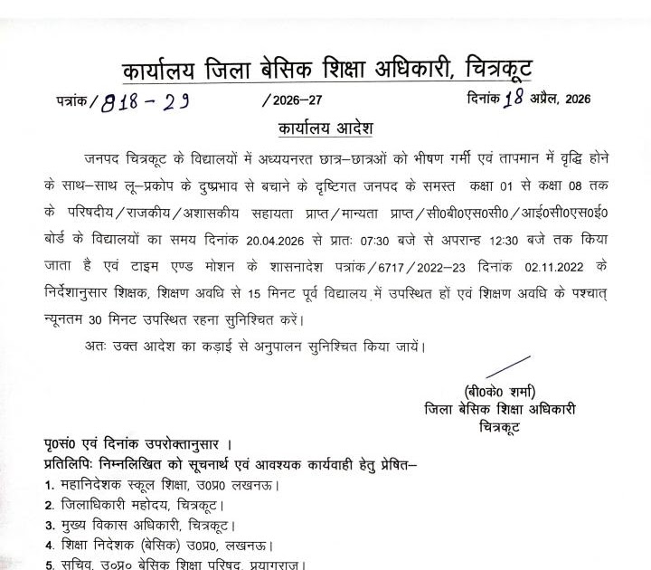 चित्रकूट में बदला स्कूल समय, 20 अप्रैल से सुबह 7:30 से दोपहर 12:30 तक कक्षाएं चित्रकूट: भीषण गर्मी और बढ़ते ...
