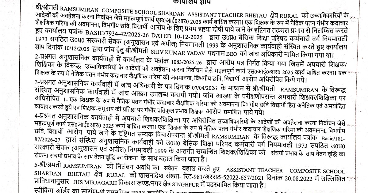 अमेठी में शिक्षिका पर बड़ी कार्रवाई: आरोप सिद्ध होने पर वेतन वृद्धि रोकी, स्थानांतरण के साथ सेवा बहाल Basic Shiksha ...