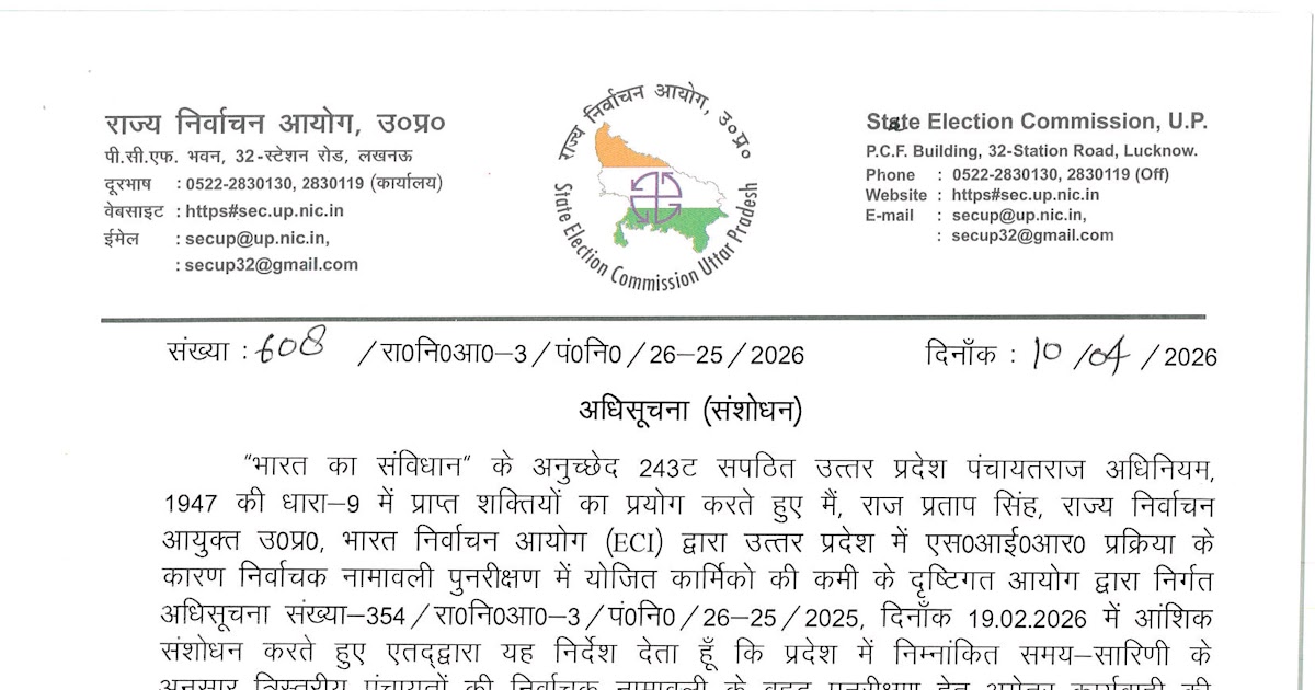 *राज्य निर्वाचन आयोग उत्तर प्रदेश द्वारा ग्राम प्रधान क्षेत्र पंचायत सदस्य के निर्वाचन नामावली का अंतिम प्रकाशन अब 22 ...