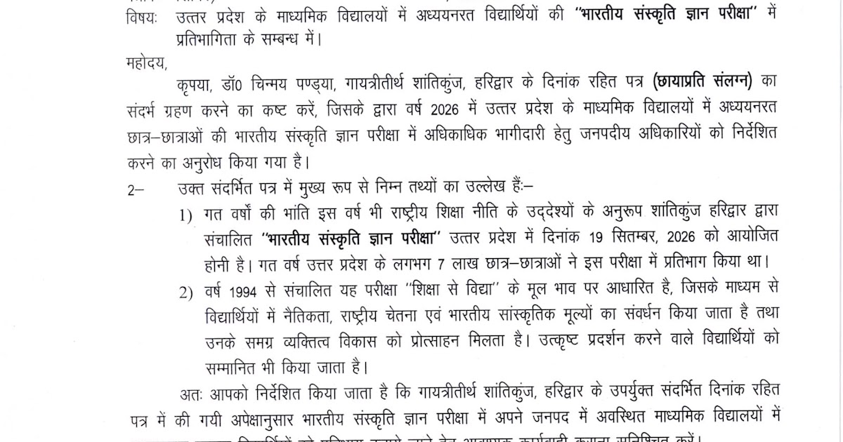 माध्यमिक विद्यालयों में भारतीय संस्कृति ज्ञान परीक्षा के आयोजन के संबंध में। – UpdateMarts| PRIMARY KA MASTER | SHIKSHAMITRA | Basic Shiksha News
