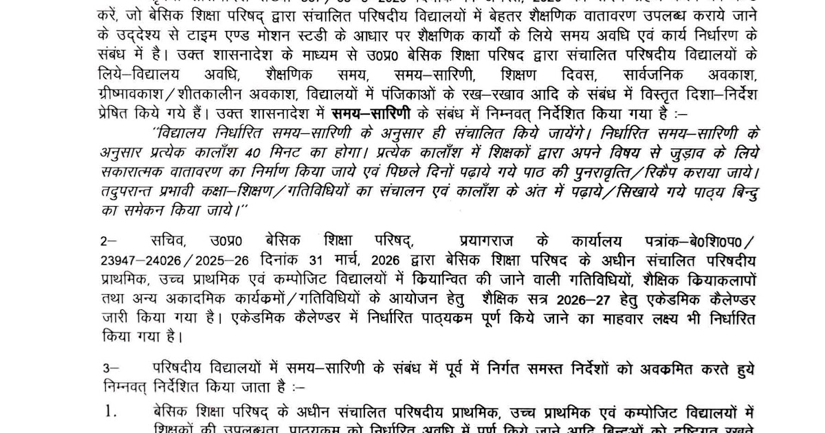 उत्तर प्रदेश बेसिक शिक्षा परिषद के नियंत्रणाधीन परिषदीय विद्यालयों में पठन-पाठन हेतु समय सारिणी (Time-Table) के निर्धारण विषयक । ...