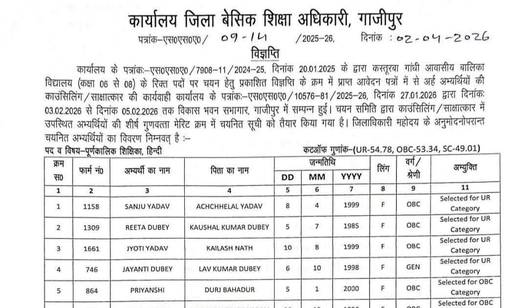 🔥 कस्तूरबा गांधी विद्यालय भर्ती 2026: गाजीपुर में शिक्षिका, चौकीदार व रसोइया पदों की सिलेक्शन लिस्ट जारी ✅