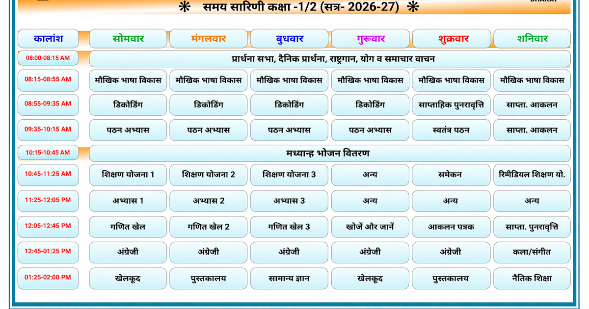 TIME TABLE OF CLASS 1/2: समय सारिणी कक्षा-1/2 शैक्षिक सत्र-2026-27 – UpdateMarts| PRIMARY KA MASTER | SHIKSHAMITRA | Basic Shiksha News