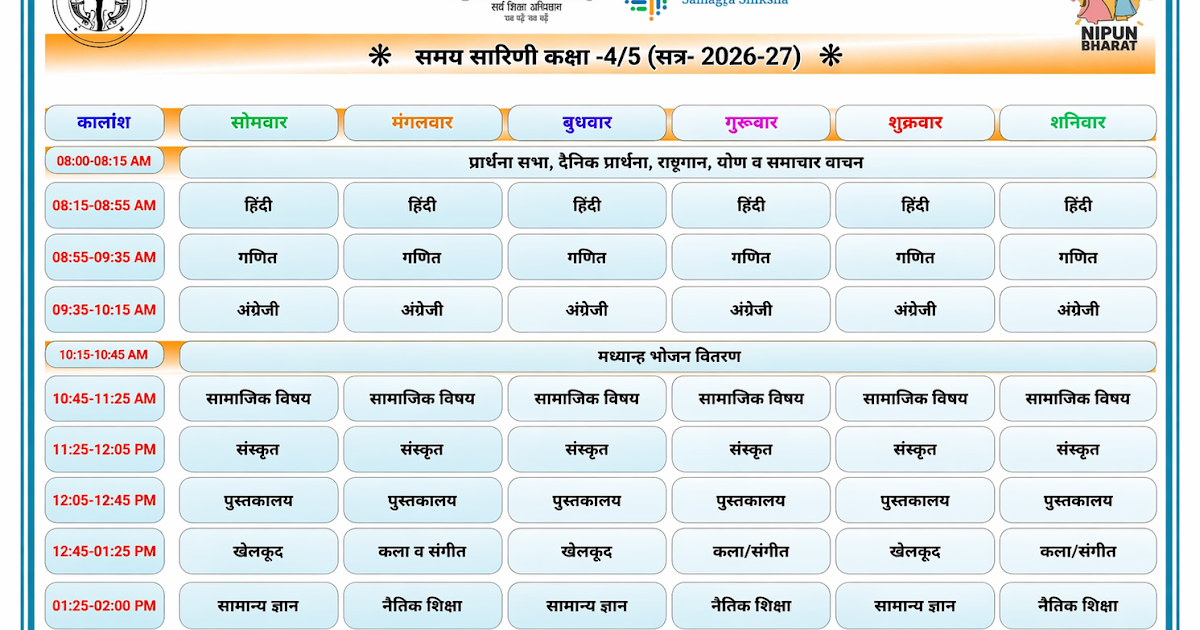 TIME TABLE OF CLASS 4/5: समय सारिणी कक्षा-4/5 शैक्षिक सत्र-2026-27 – UpdateMarts| PRIMARY KA MASTER | SHIKSHAMITRA | Basic Shiksha News