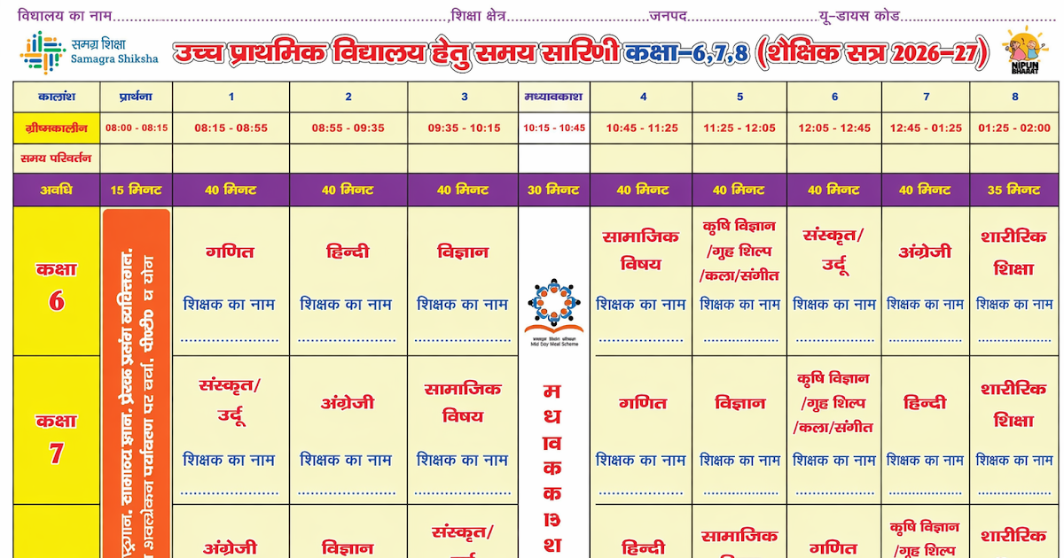 UPS TIME TABLE: उच्च प्राथमिक विद्यालय हेतु समय सारिणी कक्षा-6,7,8 – UpdateMarts| PRIMARY KA MASTER | SHIKSHAMITRA | Basic Shiksha News