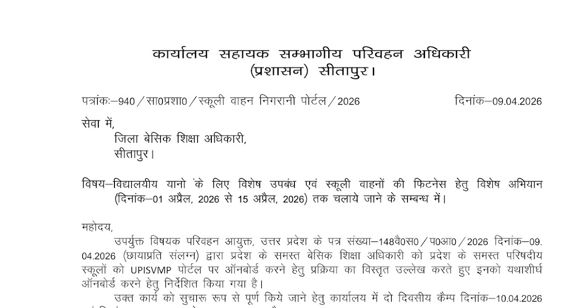 940 विद्यालयीय यानों के लिए विशेष उपबंध एव स्कूली वाहनों की फिटनेस हेतु विशेष अभियान (दिनांक-01 अप्रैल, 2026 से 15 अप्रैल, 2026) तक चलाये जाने के सम्बन्ध में। – UpdateMarts| PRIMARY KA MASTER | SHIKSHAMITRA | Basic Shiksha News