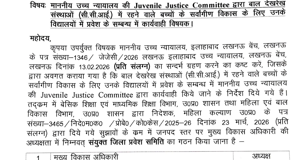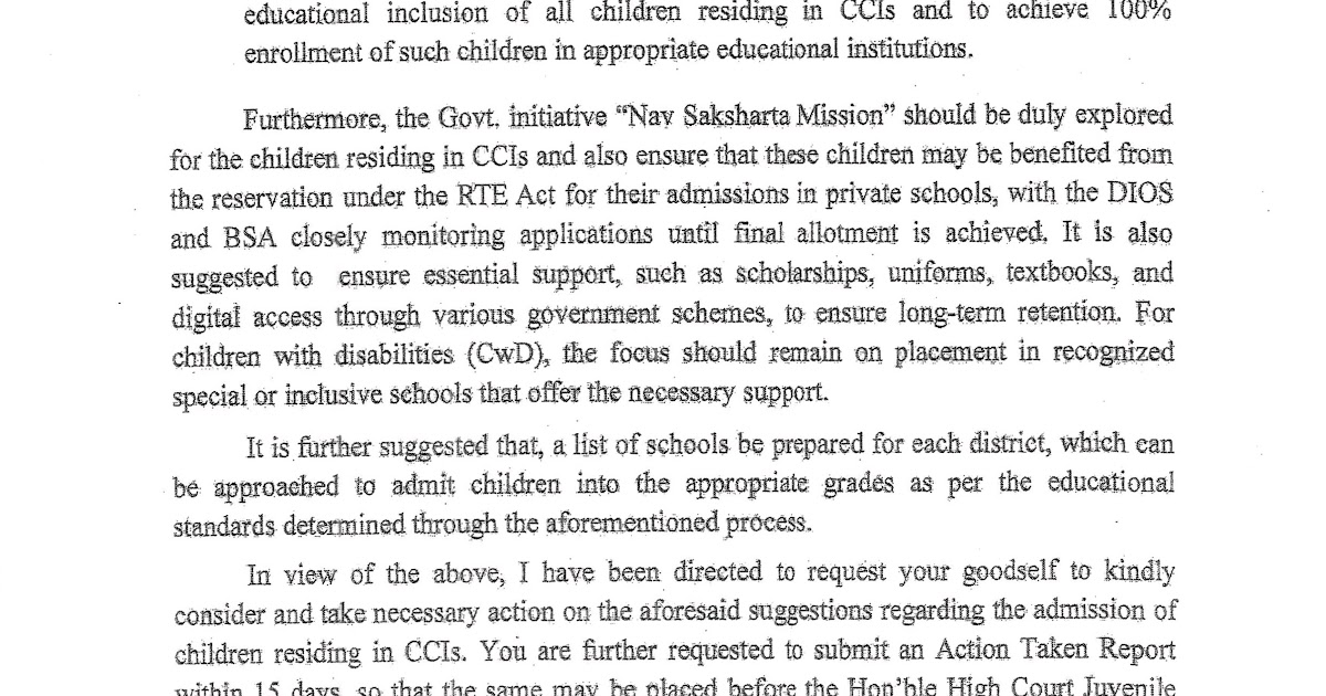 माननीय उच्च न्यायालय की Juvenile Justice Committee द्वारा बाल देखरेख संस्थाओं (सी.सी.आई.) में रहने वाले बच्चों के सर्वांगीण विकास के लिए उनके विद्यालयों में प्रवेश के सम्बन्ध में कार्यवाही विषयक। – UpdateMarts| PRIMARY KA MASTER | SHIKSHAMITRA | Basic Shiksha News