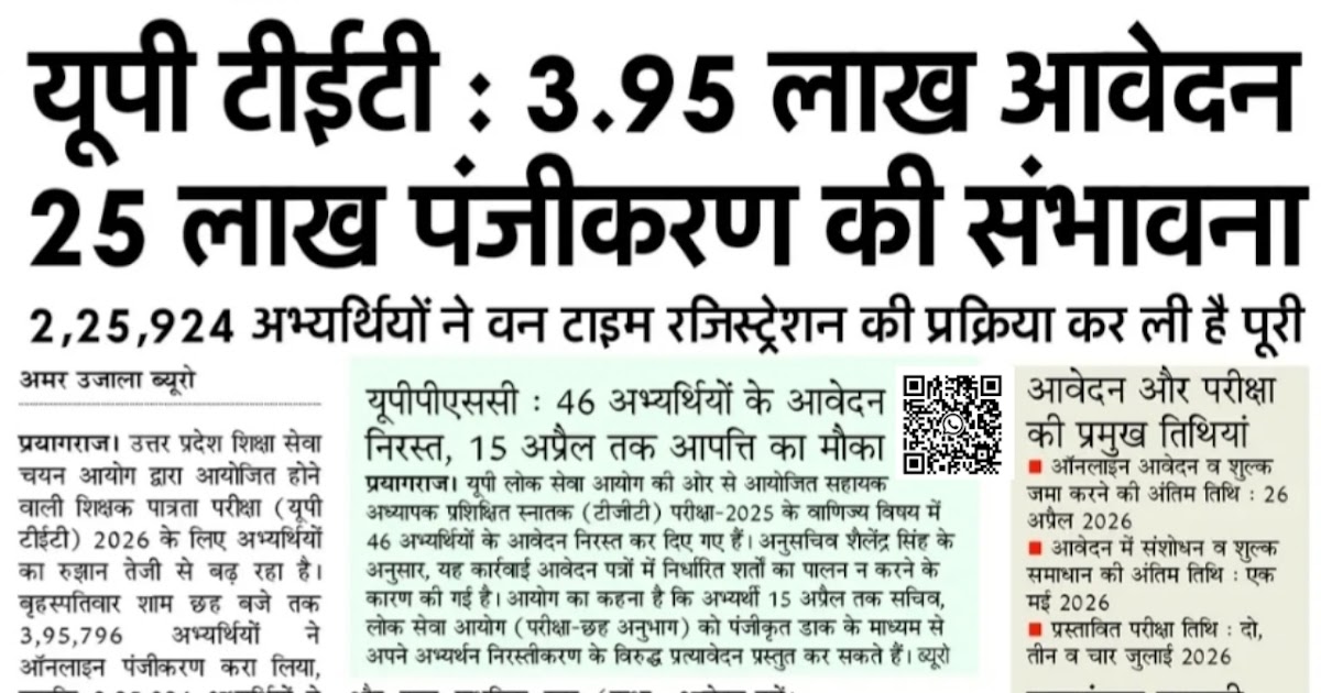 यूपी टीईटी (UPTET) 2026 के लिए आवेदन प्रक्रिया जारी है। 3,95,796 अभ्यर्थियों ने ऑनलाइन आवेदन किया