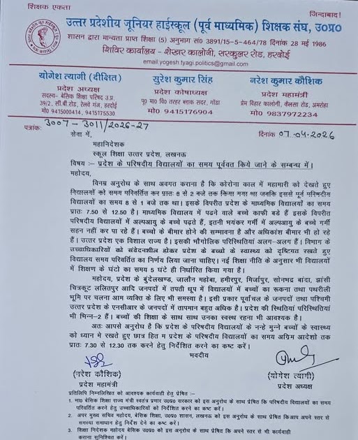 प्रदेश के परिषदीय विद्यालयों का समय कोरोना काल के पूर्व की स्थिति में किये जाने की मांग संगठन द्वारा की गई है। – UpdateMarts| PRIMARY KA MASTER | SHIKSHAMITRA | Basic Shiksha News