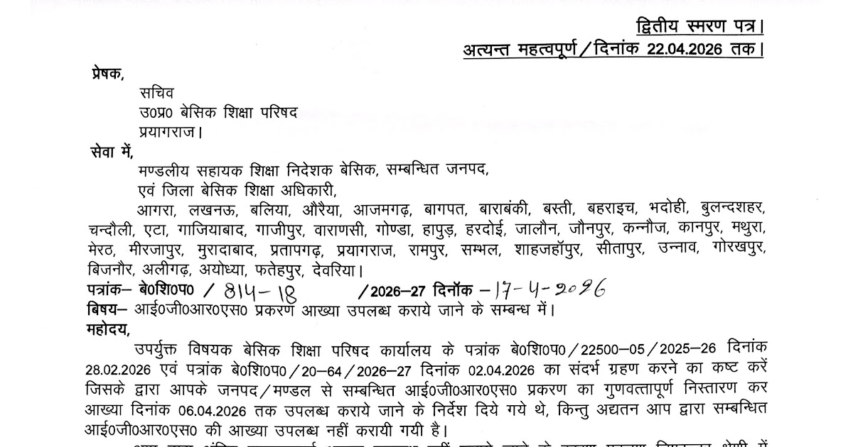 अत्यंत महत्वपूर्ण: बेसिक शिक्षा परिषद के लंबित मामलों पर त्वरित निस्तारण हेतु अंतिम निर्देश (22 अप्रैल 2026 तक) – UpdateMarts| PRIMARY KA MASTER | SHIKSHAMITRA | Basic Shiksha News