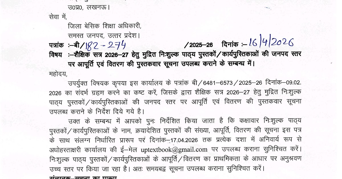 शैक्षिक सत्र 2026-27 हेतु मुद्रित निःशुल्क पाठ्य पुस्तकों /कार्यपुस्तिकाओं की जनपद स्तर पर आपूर्ति एवं वितरण की पुस्तकवार सूचना उपलब्ध कराने के सम्बन्ध में। – UpdateMarts| PRIMARY KA MASTER | SHIKSHAMITRA | Basic Shiksha News