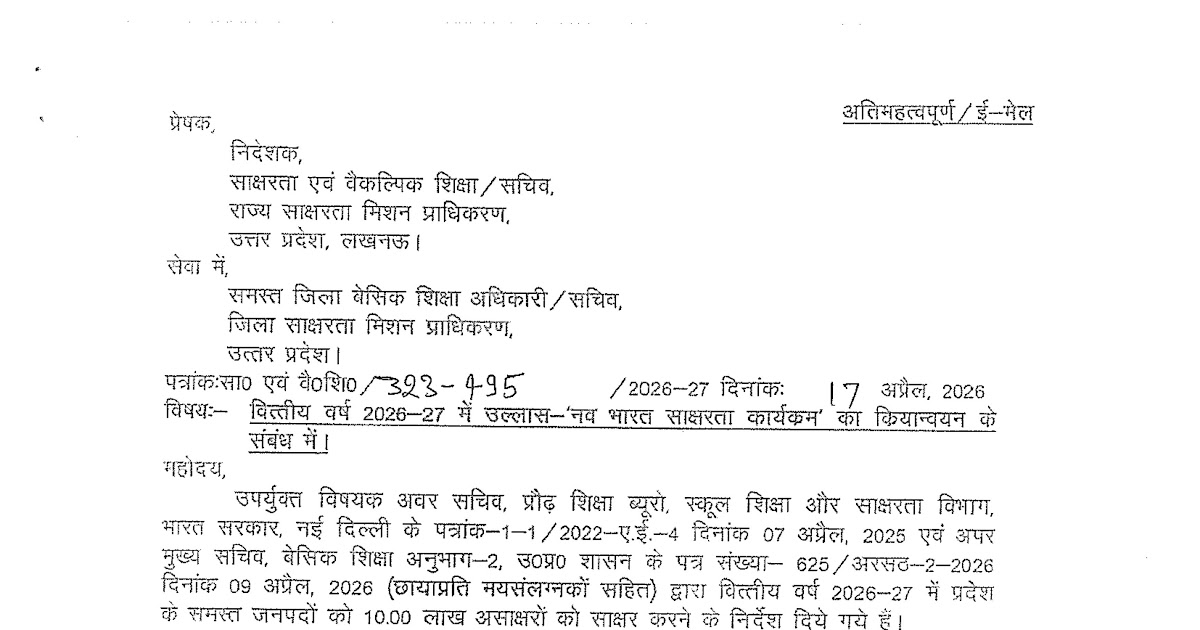 वित्तीय वर्ष 2026-27 में उल्लास- ‘नव भारत साक्षरता कार्यक्रम’ का कियान्वयन के संबंध में । – UpdateMarts| PRIMARY KA MASTER | SHIKSHAMITRA | Basic Shiksha News