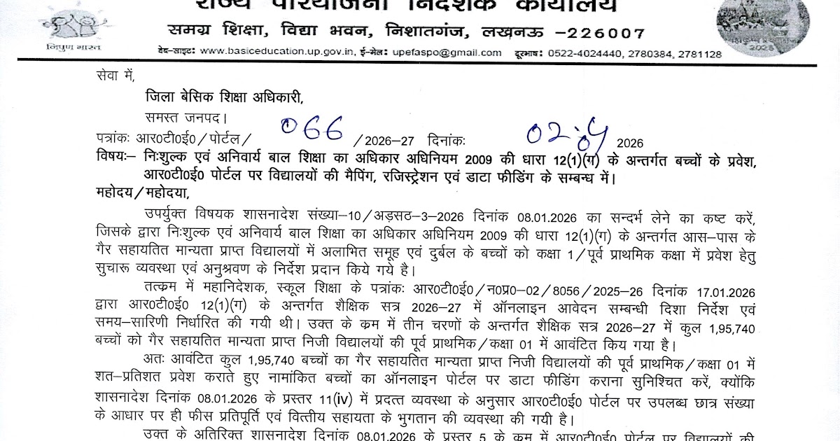 लखनऊ,। महानिदेशक, स्कूल शिक्षा एवं राज्य परियोजना निदेशक (समग्र शिक्षा) द्वारा प्रदेश के सभी जिला बेसिक शिक्षा अधिकारियों को आरटीई ...