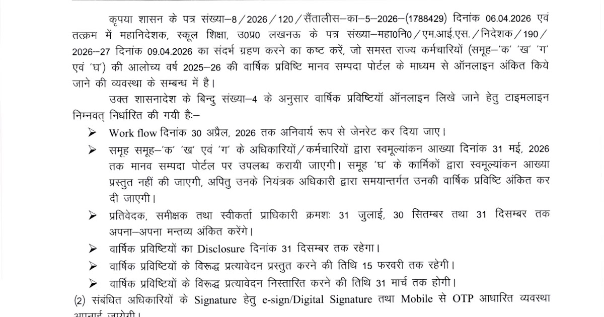 वर्ष 2025-26 की वार्षिक प्रविष्टि मानव सम्पदा पोर्टल के माध्यम से ऑनलाइन अंकित किये जाने की व्यवस्था के सम्बन्ध ...