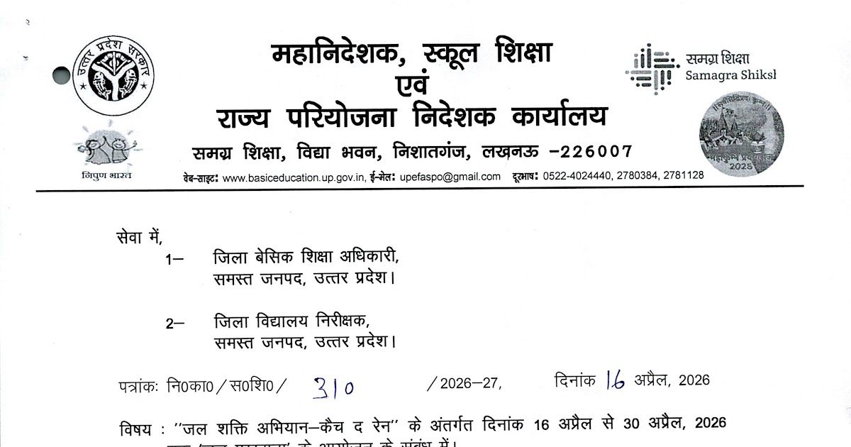 ‘‘जल शक्ति अभियान-कैच द रेन’’ के अन्तर्गत दिनांक 16 अपै्रल, 2026 से 30 अपै्रल, 2026 तक ‘जल पखवाड़ा’ के आयोजन के सम्बन्ध में। – UpdateMarts| PRIMARY KA MASTER | SHIKSHAMITRA | Basic Shiksha News