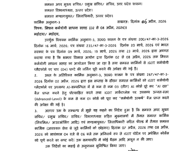 समस्त कार्यालयाध्यक्ष, बेसिक शिक्षा एवं माध्यमिक शिक्षा। आप अवगत हैं कि दिनांक 02-08 अप्रैल 2026 तक मिशन कर्मयोगी अंतर्गत साधना ...